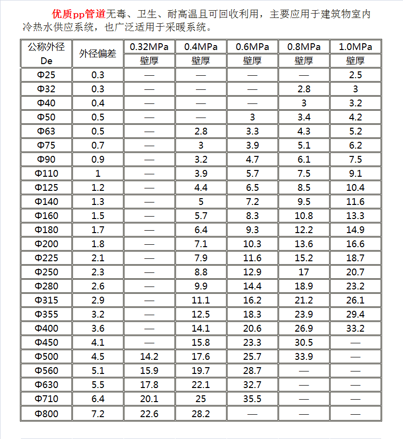 聚丙烯PP管依據(jù)QB1929-93標(biāo)準(zhǔn)生產(chǎn),規(guī)格De20-De1000mm,公稱壓力0.4-1.6MPa,聚丙烯PP管材適用于市政給排水、農(nóng)田灌溉、腐蝕性液體輸送(如化工醫(yī)藥行業(yè))等領(lǐng)域。